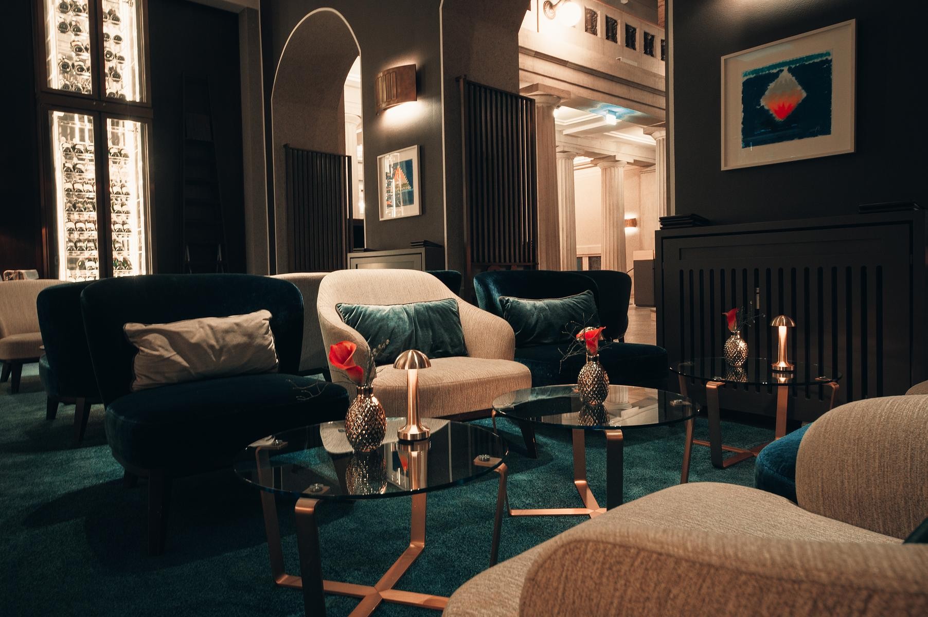Elegante Hotelbar The Wellem in Düsseldorf mit großem Kronleuchter, beleuchteten Spirituosenregalen und stilvollen Barhockern in luxuriösem Ambiente.