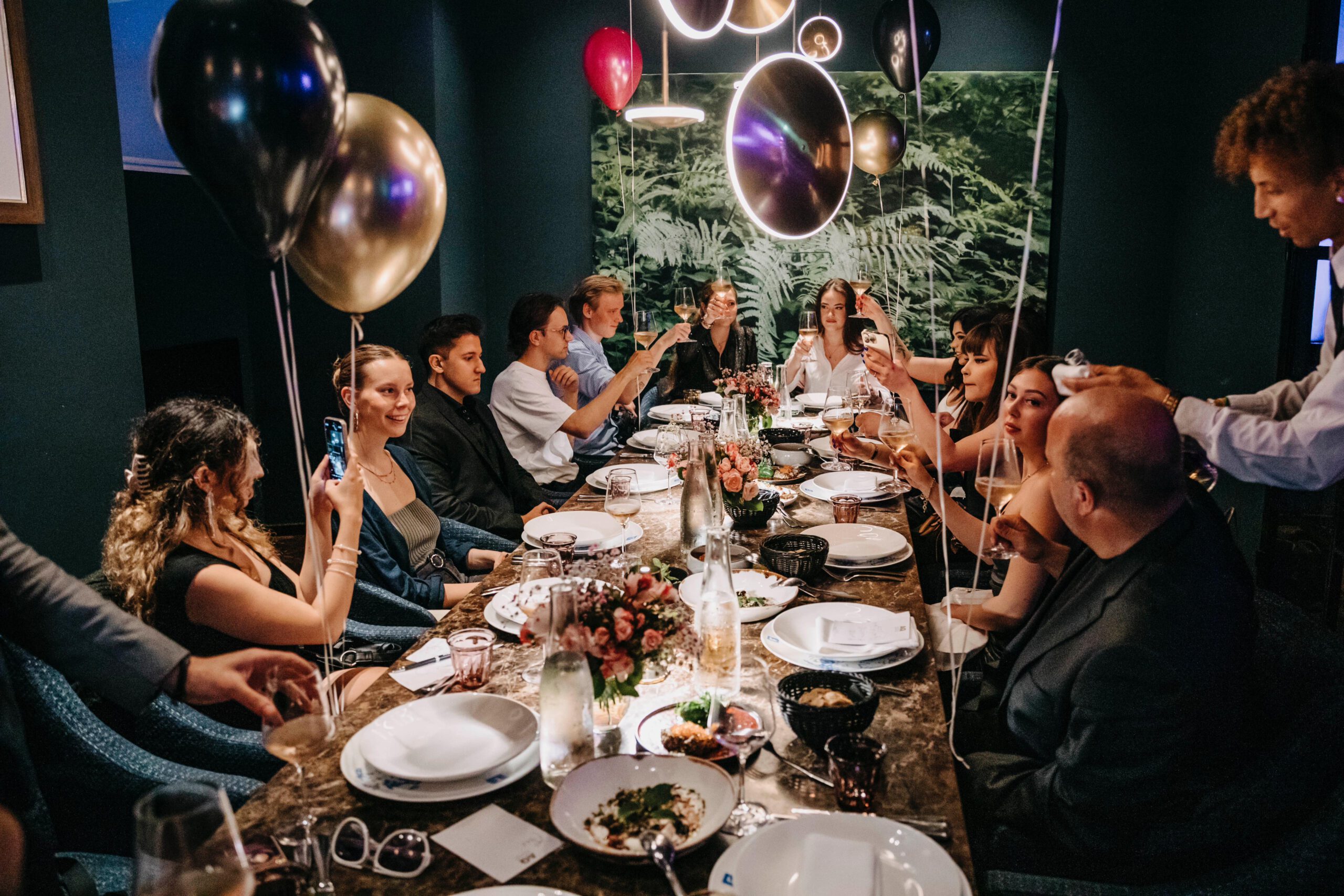 Elegantes Fine-Dining-Ambiente im Restaurant Mbassy by Franks im The Wellem Düsseldorf mit dunklem Interieur, moderner Wandkunst, runden Tischen und eingedeckten Weingläsern.